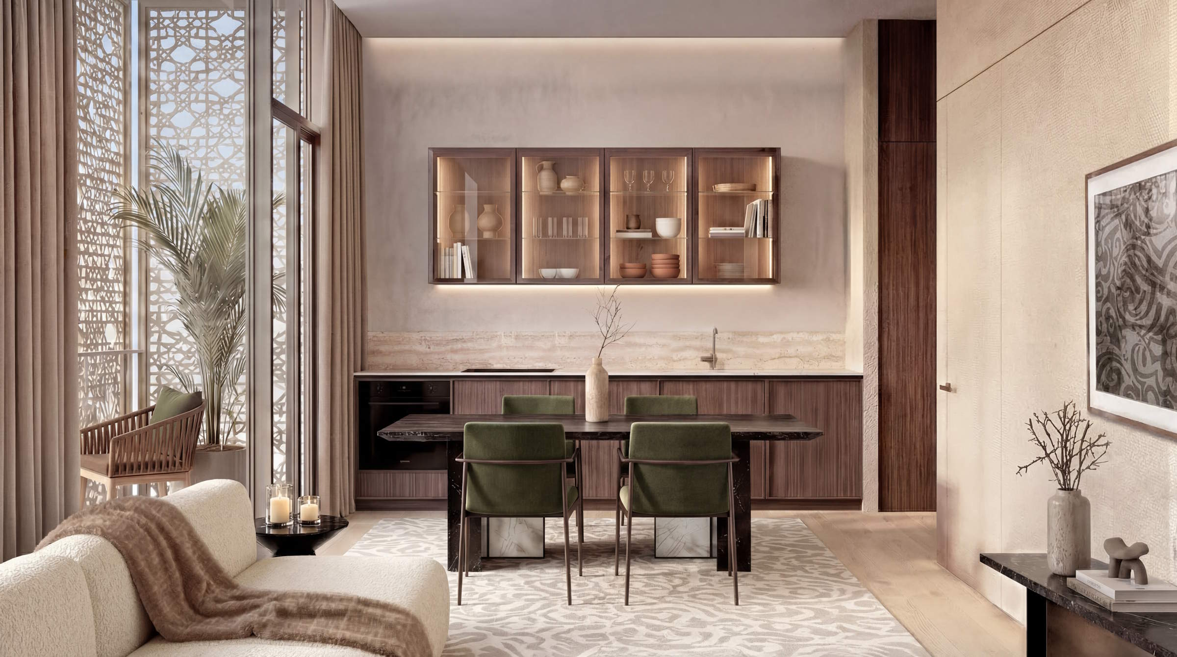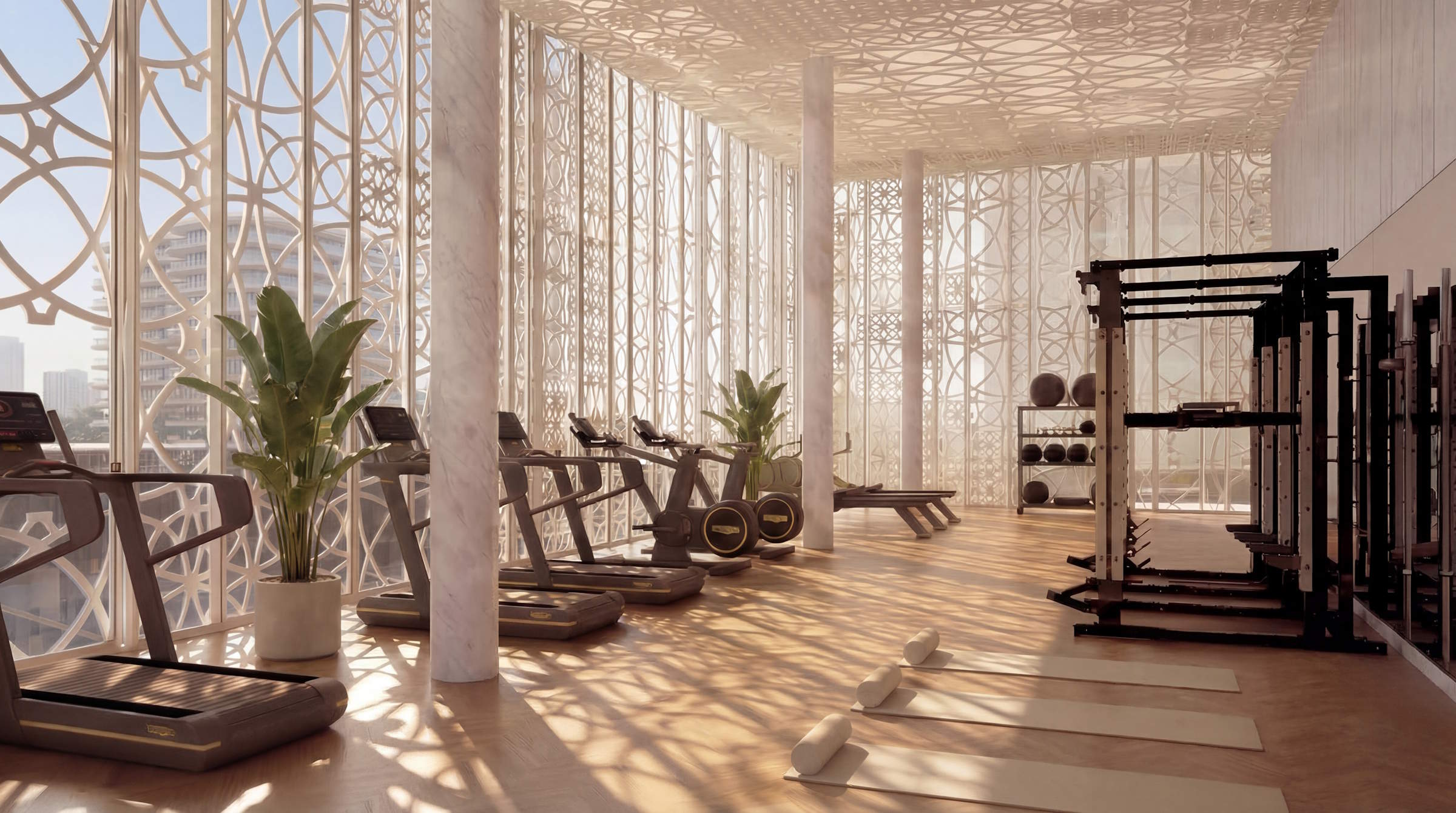 The project offers fully furnished studios, 1BR and 2BR apartments from 36.8 to 110 sq. m, featuring dynamic Mashrabiya facade screens for privacy and light control.